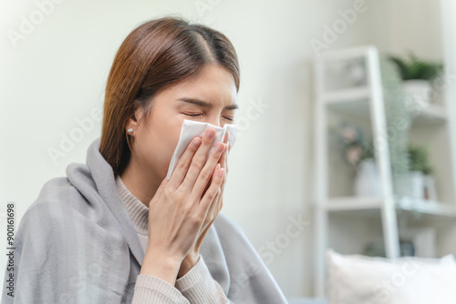Female unhealthy Sickness, asian young woman, girl unwell and coughing, have cold, sore throat isolated white background suffering with symptom cough feeling bad. Healthcare of Coronavirus, covid-19.