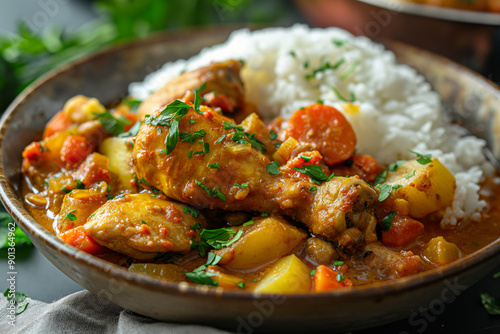 Poulet DG, a popular Cameroonian chicken dish, featuring marinated chicken pieces cooked with a medley of vegetables including carrots, green beans, and plantains, creating a savory and slightly sweet
