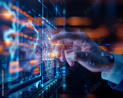 A hand interacts with a digital interface displaying data and maps, emphasizing technological advancement and data analysis.