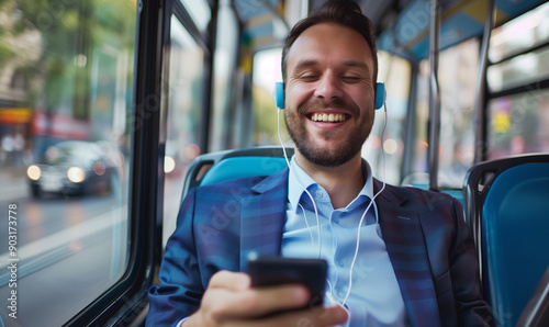 Uśmiechnięty mężczyzna w słuchawkach jedzie autobusem miejskim