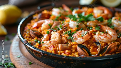 Homemade paella with shrimp and mussels served in a bowl