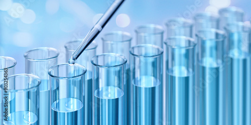 Test tubes filled with blue liquid. A pipette is dispensing a droplet. Scientific chemistry research, analysis. Laboratory setting, medicine development, biotechnology, pharmaceutical, medical lab, 3D