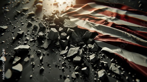 In a dystopian world, sovereign debt crisis erupts as national flags crumble into dust, with sunlight filtering through the disintegrating emblems
