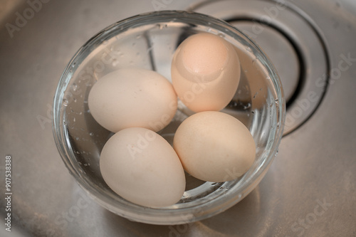 Jajka ugotowane na twardo chłodzone w misce z zimna woda w zlewie kuchennym