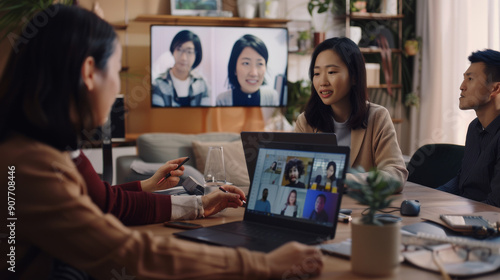 A hybrid meeting with two people in the room and others on a video call, focusing on effective communication and collaboration.