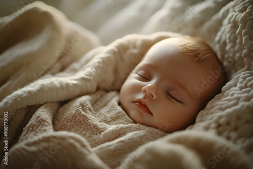 Noworodek, niemowlę, sen noworodka, śpiące dziecko, noworodek, dwa tygodnie, miękki kocyk, spokojny sen, urocza twarz, delikatne światło, przytulność, bezpieczeństwo, ciepło, tekstura, spokój,