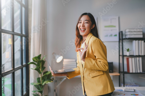 Smiling young asian businesswoman holding laptop and making ok sign while standing in modern office