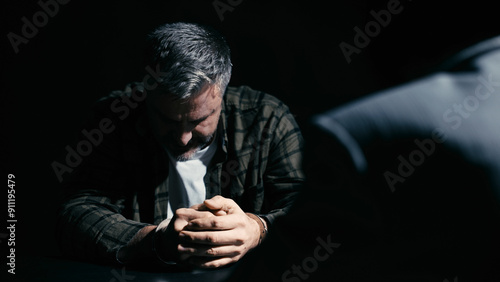 Distraught man in handcuffs keeping his head down, crime suspect, interrogation