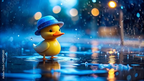 A Rainy Night Adventure: A Tiny Duck in a Blue Hat Braving the Storm AI generated