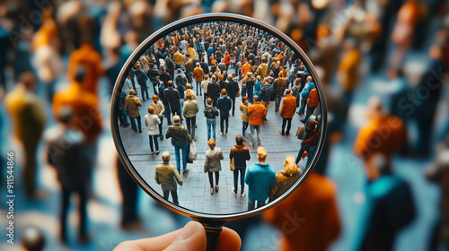 Magnifying glass focusing on diverse crowd.