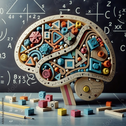 Cerebro de madera con formas geométricas y símbolos matemáticos. representa el conocimiento de las matemáticas, la física y la neurología.