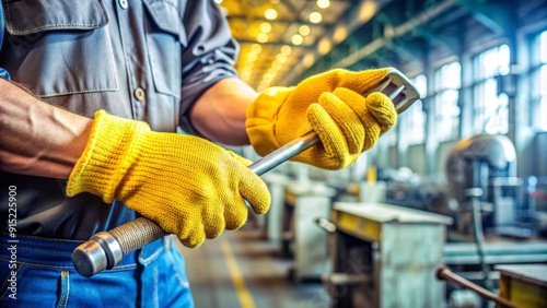 A close-up of a worker's hand wearing a durable yellow glove, holding a tool, with a blurred industrial background, emphasizing safety and occupational protection.