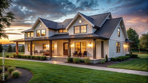 Beautiful modern farmhouse home exterior at dusk with lights on and green grass, architectural photography