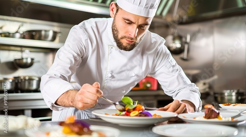 Chef meticulously plating a gourmet dish in a busy restaurant kitchen during lunch service