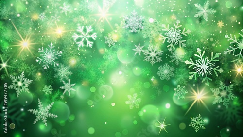 Vibrant green abstract background with delicate snowflakes gently falling, creating a mesmerizing winter wonderland scene with a touch of festive magic and serenity.