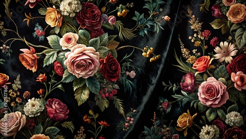 Dark romantic mystique abounds in this dramatic black floral background featuring intricate blooms and swirling foliage on a mysterious, inky black velvet canvas.