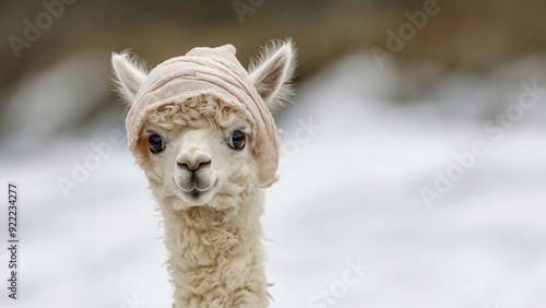 Entzückendes Portrait eines jungen Alpakas mit weichem, flauschigem Fell. Große, ausdrucksstarke Augen blicken direkt in die Kamera und vermitteln Unschuld und Niedlichkeit.