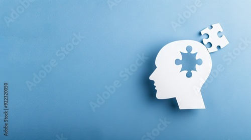Conceptual representation of mental health with a white paper head and missing puzzle piece on a serene blue background