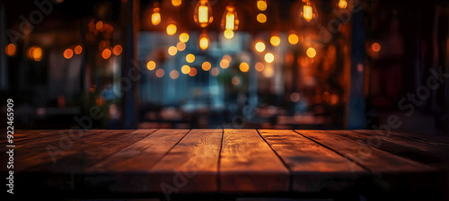 Una mesa de madera oscura con un fondo difuminado del interior de un bar o cafetería por la noche, iluminado por bombillas Edison antiguas. El primer plano tiene un efecto de luz de destellos que crea