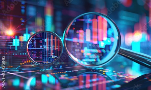 Magnifying Glass Examining Data on a Screen with Financial Charts and Graphs