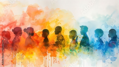 Design a watercolor banner depicting silhouettes of diverse age groups, representing the celebration of family, care, and generational mutual understanding