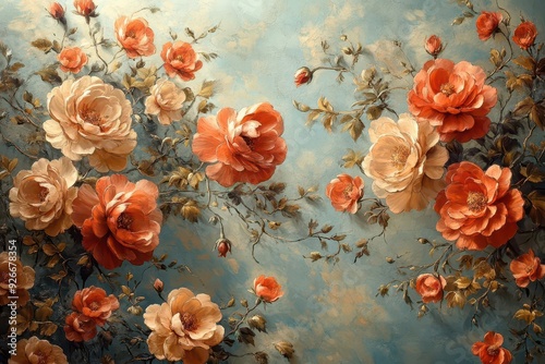ornate floral ceiling fresco intricate baroquestyle flowers and vines painted on a domed ceiling rich gold leaf accents soft diffused light enhancing threedimensional effect