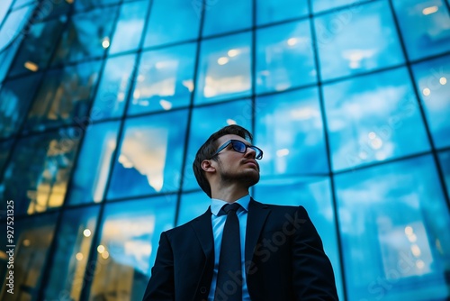 A suited businessman stands in front of a modern glass building, showcasing professional confidence and corporate success.