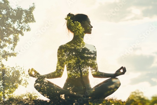 Double exposure of young woman meditating in nature, creating captivating yoga photography art