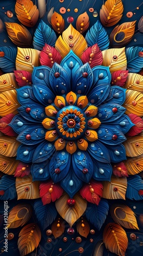 Vibrant Abstract Mandala with Colorful Feathers and Intricate Patterns in Blue, Yellow, and Orange Tones