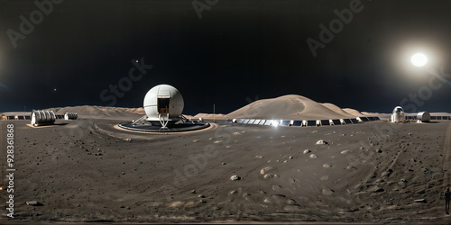 Full 360 degrees seamless spherical panorama HDRI equirectangular projection of A futuristic moon base. Texture environment map for lighting and reflection source rendering 3d scenes.