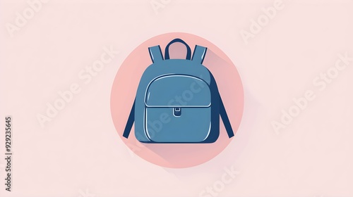 minimalistyczna ilustracja, plecak szkolny, widok od frontu, proste linie, kształty, stonowany niebieski kolor, pastelowy różowy background, subtelny okrągły akcent, miękkie cienie, brak dodatkowych d