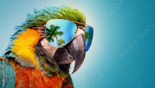 primer plano de cotorra con gafas de sol con reflejos de palmeras