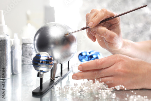Kobieta dekoruje bombki. świąteczne ozdoby choinkowe