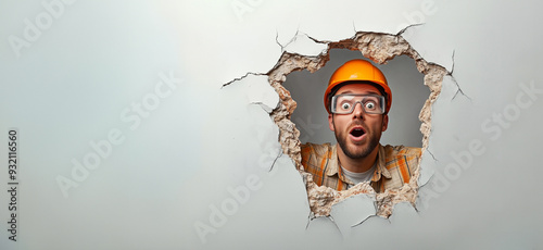 Junger Bauarbeiter schaut erschrocken durch ein Loch in der Wand