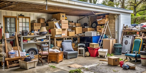 broken appliances, clutter, cardboard boxes, household junk, A cluttered suburban garage corner filled with old furniture broken appliances cardboard boxes and random household junk