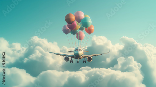 Passenger airplane tied to colorful balloons floating in the sky, Airplane with the balloons lifting as it gently drifts among the clouds