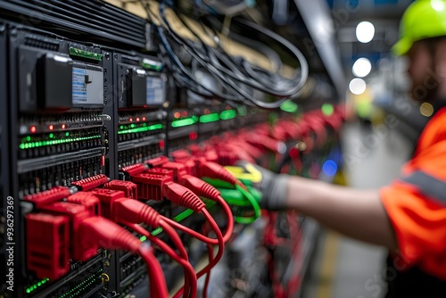 A server farm under construction, with new racks being installed and cables being laid out.