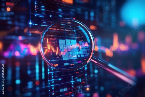 Magnifying glass over data grid with glowing charts, vibrant bokeh lights, sharp details, technology