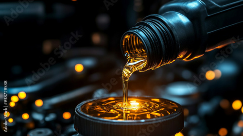 motor oil being poured from a black bottle, emphasizing its smooth flow and texture. Represents vehicle maintenance, lubrication, and the importance of car care