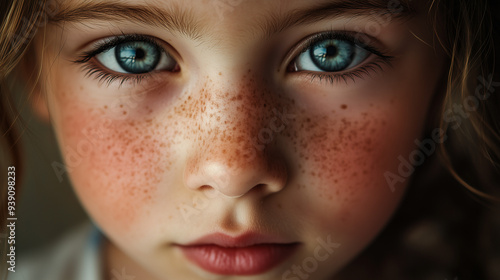 Zbliżenie na oczarowujące spojrzenie i niewinny wyraz twarzy młodej dziewczynki z wyrazistymi szarymi oczami i delikatną, piegowatą cerą.