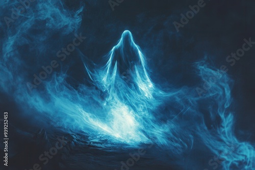 A glowing blue spectral figure emanates mystical energy, surrounded by swirling ethereal mists in a dark space.