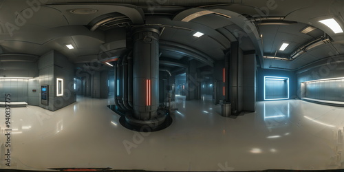 Full 360 degrees seamless spherical panorama HDRI equirectangular projection of stark black and white modern interior. Texture environment map for lighting and reflection source rendering 3d scenes.