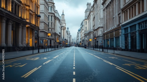 A peaceful scene of an empty urban road with classical architecture, emphasizing the grandeur of the city heritage.