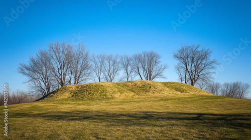 Malownicza sceneria przedstawia trawiasty pagórek, delikatnie wynurzający się z płaskiego terenu pod rozległym, jasnym niebem.