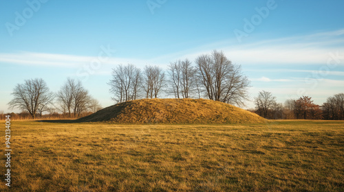 Malownicza sceneria przedstawia trawiasty pagórek, delikatnie wynurzający się z płaskiego terenu pod rozległym, jasnym niebem.