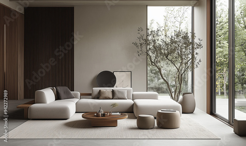 Minimalistyczny styl nowoczesnego salonu. Proste meble, rośliny i przeszklenia
