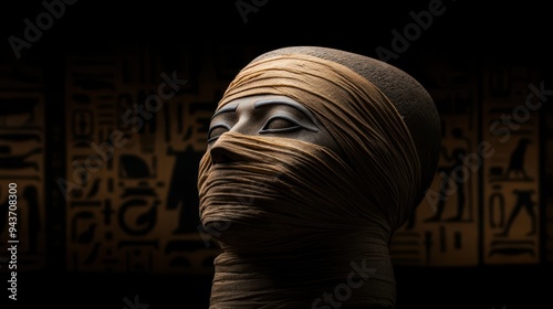 A stunning photograph of a mummy mask, showcasing intricate details and rich history, with a mysterious and captivating atmosphere.