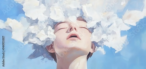 A serene representation of imagined thoughts with a figure surrounded by ethereal clouds against a clear blue sky.
