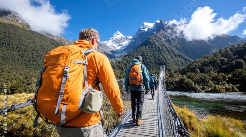 Several hikers equipped with orange backpacks crossing a sturdy suspension bridge, surrounded by lush greenery and snowy mountain peaks under a bright blue sky.