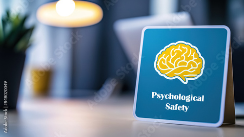 A sticker an office displays the text psychological safety and a logo depicting a human brain in a blue color